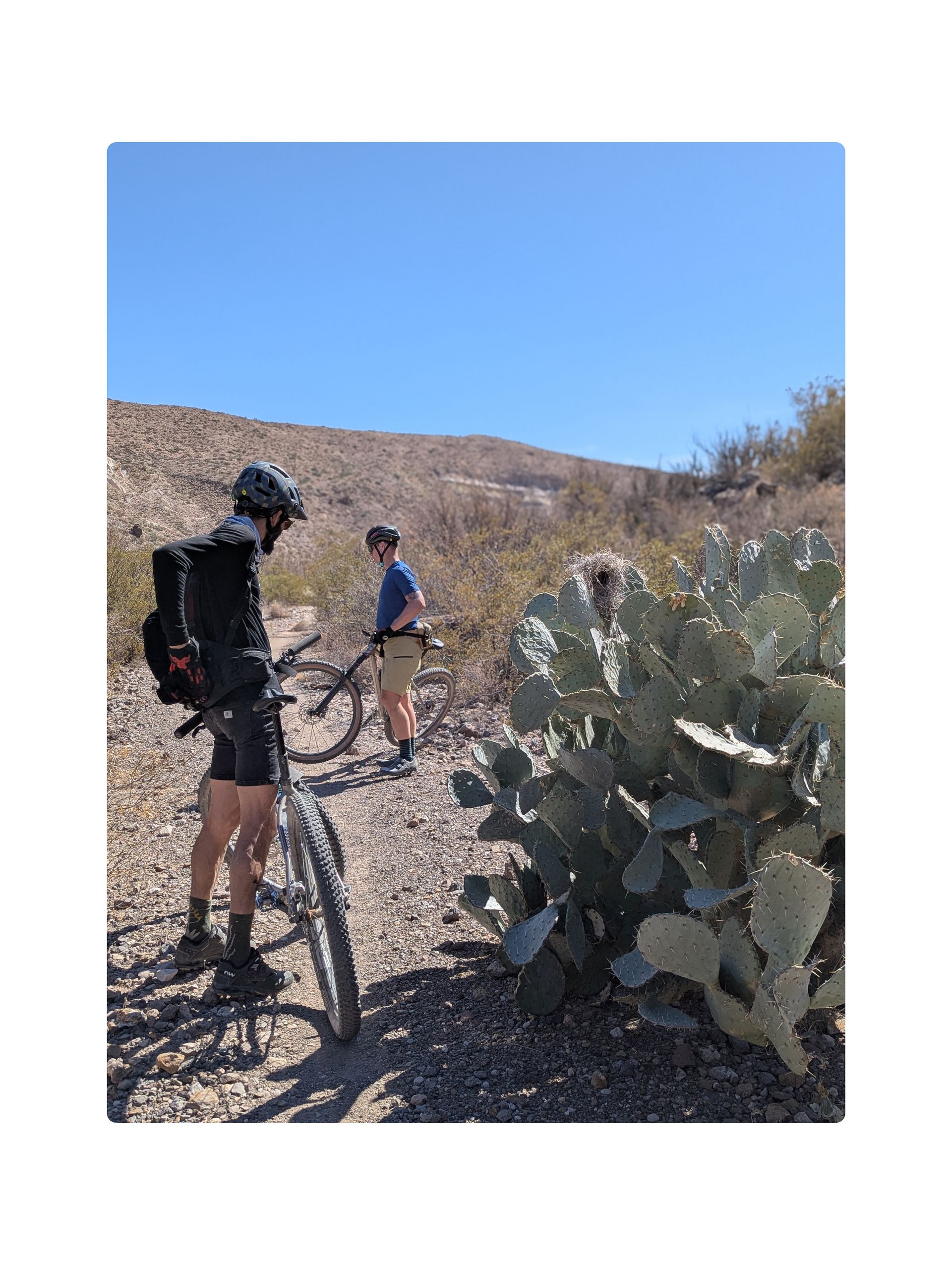 Riding in the desert at Big Bend is wildly unique and satisfying. One thing I had to absolutely remember to do was....look around! Sometimes that was tough because I was either chasing Vince or Conrad up or down or whatever. The terrain varies. It's fast and flowy, rocky and technical, sandy and sluggish, or.....steep. Sometimes, when you're descending the rocks sound like pottery breaking on the floor. It's a sound that reminds you if you fall, it's going to badly hurt, and if you do get hurt you'll probably have to be air lifted out of there. That thought is always drifting in the back of your mind: there's no help on the way. It's just another dynamic of the desert that one must consider. On the other side of that coin though is trust. If you don't trust in the desert it will hurt you, if you don't stop and consider the desert, it will knock you down a peg or two. It is in control. It has life.